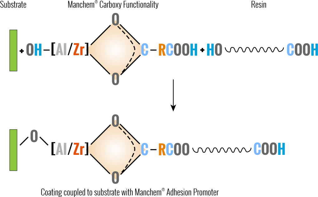 The highly metallic nature of zircoaluminates makes them uniquely reactive with many surfaces. The inorganic functional groups chemically interact with the substrate while the organofunctional groups react with the resin producing a complex network of bridging bonds.